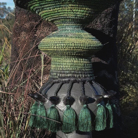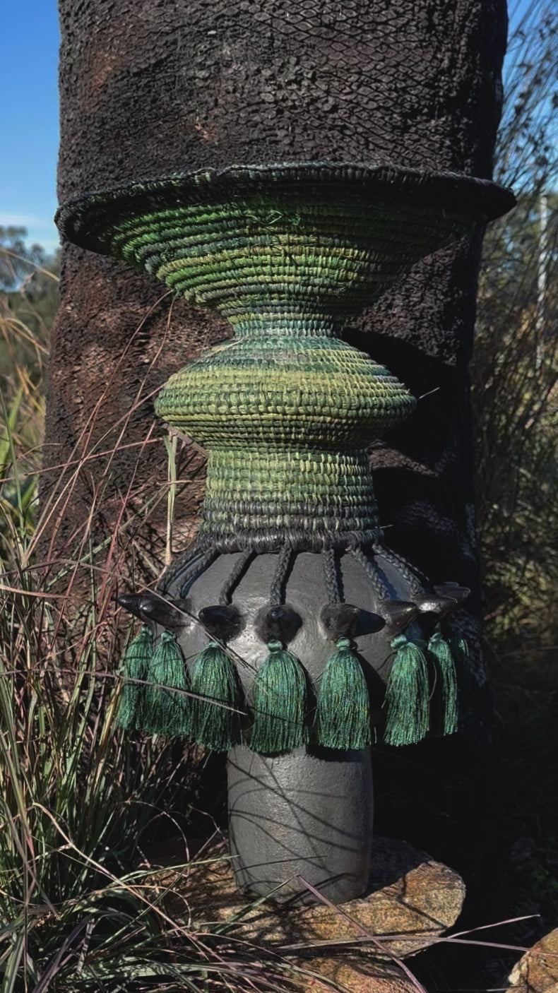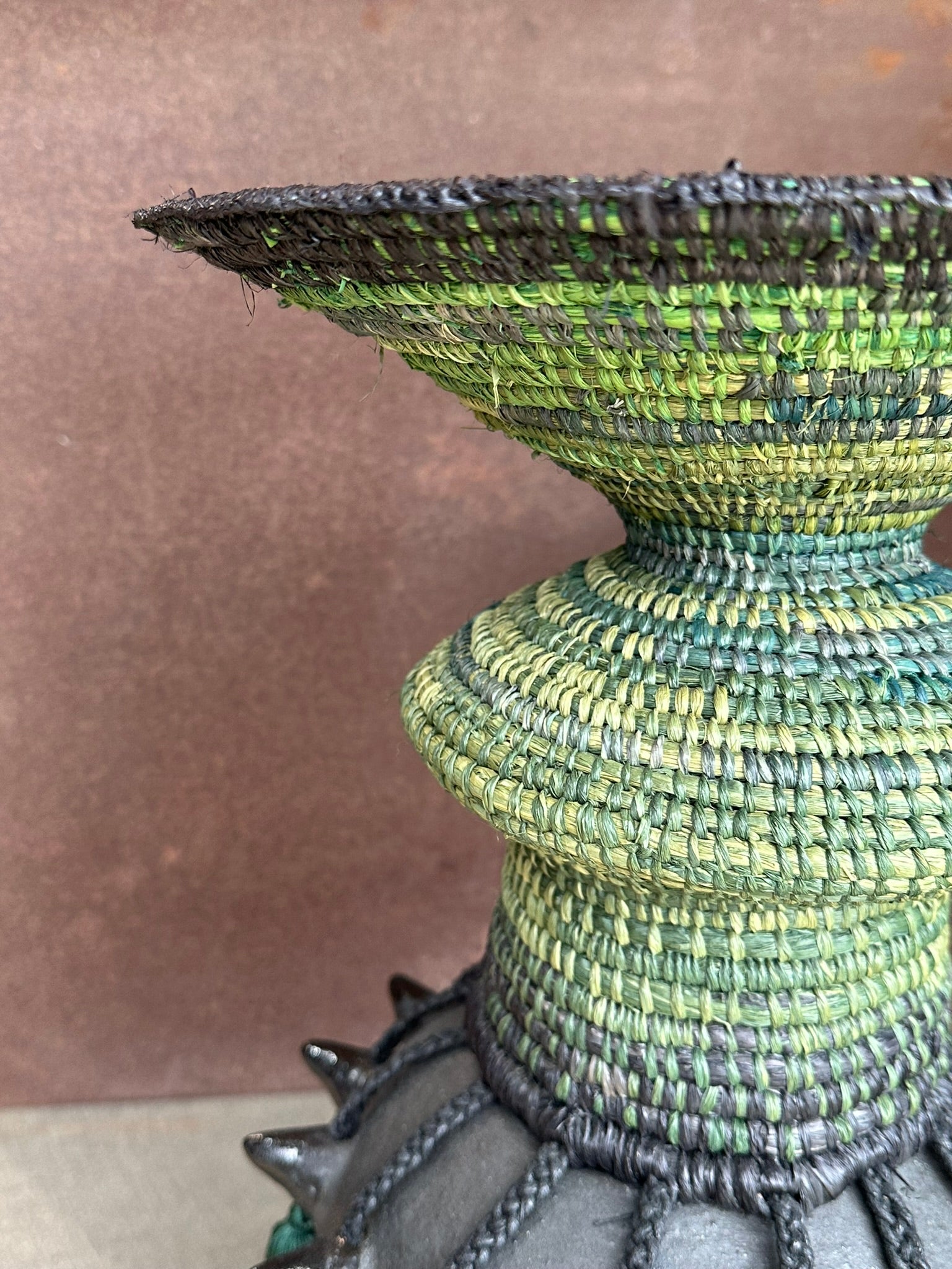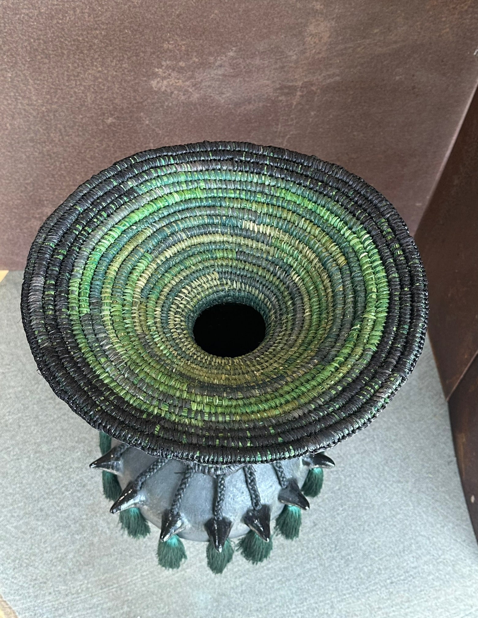 Ceramic base with dyed raffia coiled top. Cotton rope and silk tassels. It has some wire woven in the base to give it strength.