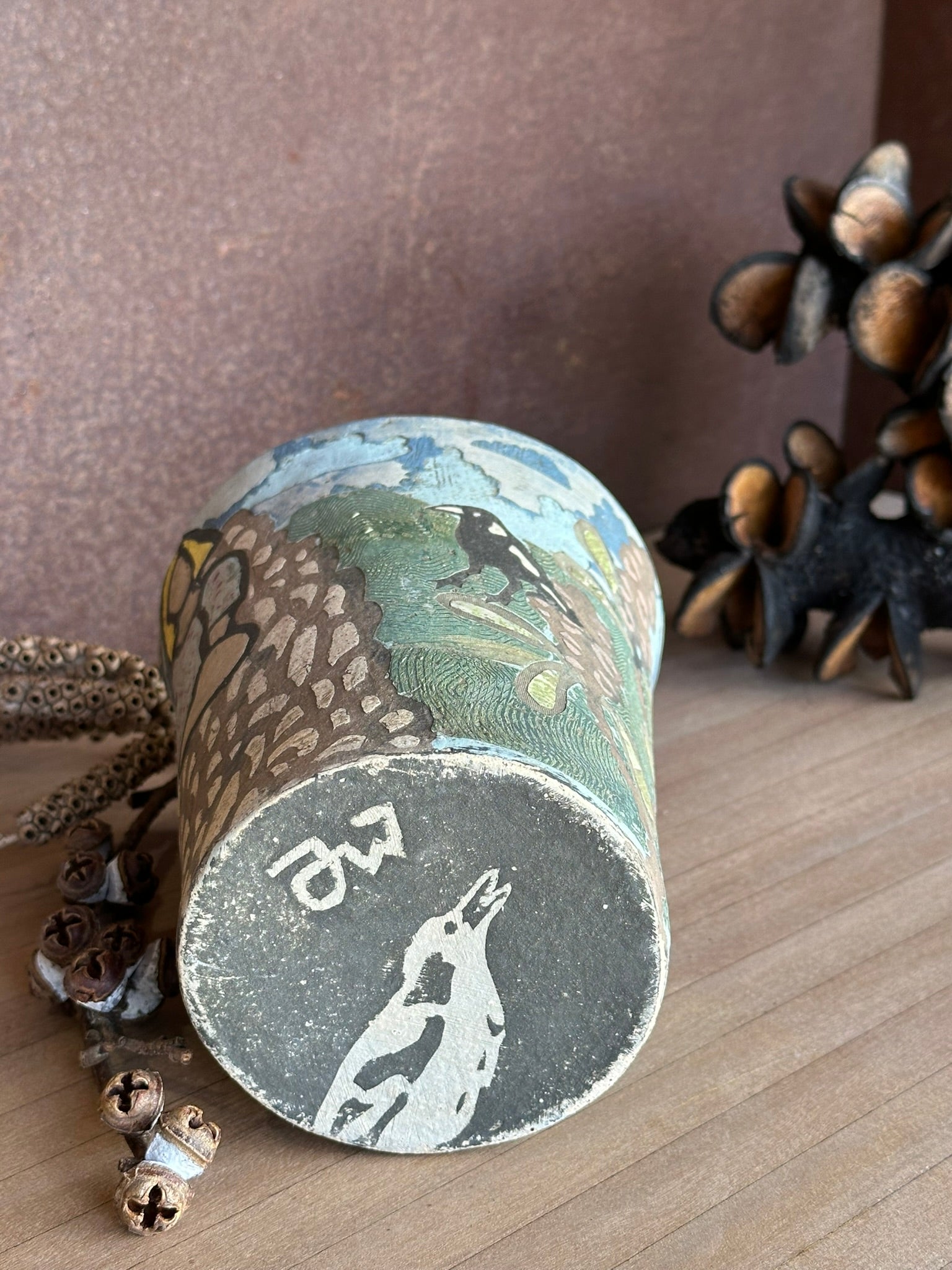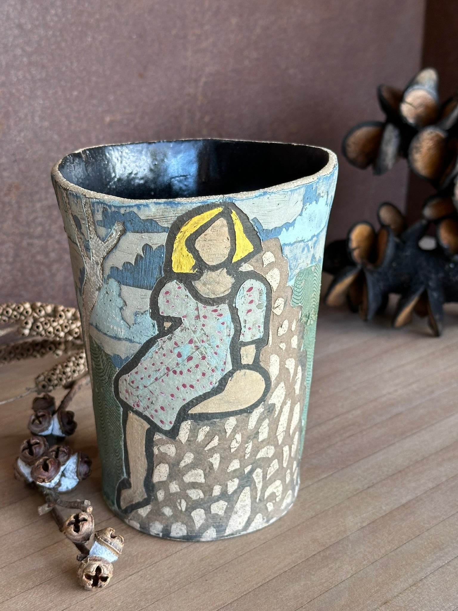 Vase or container with hand-cut stencil, slips and underglaze monoprint.